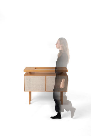 Tal qual uma arquitetura, o bar Sylvia se eleva sobre pilotis que partem do chão, atravessam o volume semi-transparente e extravasam a cobertura, dando suporte a uma laje recortada. A caixa em madeira é envolvida por uma espécie de pele tecida em palha de seda, permitindo ver através. No topo, o coroamento da peça serve de apoio para garrafas. ‘’O desenho é certamente um resultado do que aprendi durante minha formação acadêmica, em uma escola fortemente influenciada pelo modernismo. No Sylvia, visualizo as linhas de uma casa que certamente projetaria se atuasse como arquiteto”, complementa o designer. O bar se desdobra em uma coleção também composta por aparador e home.